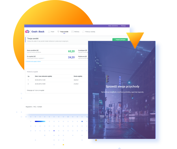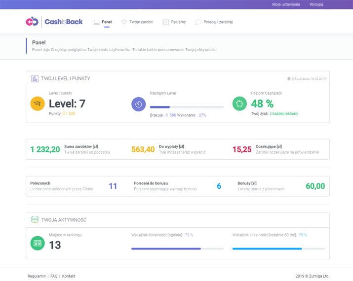 Konto użytkownika daje podgląd na reklamy i zarobki. Tutaj zlecisz także wypłatę pieniędzy (próg wyplaty już od 20 zł).